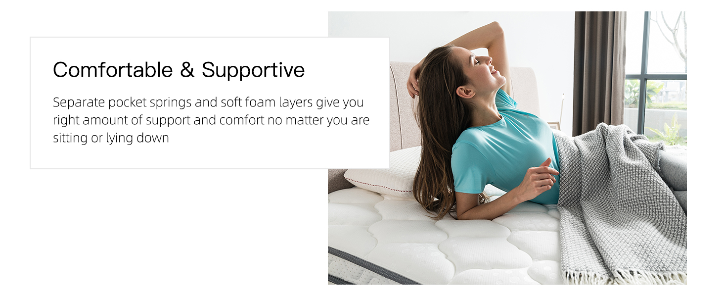 The independent pocket springs and multi-layer comfort foams provide targeted spinal support and keep your spine aligned throughout the night, helping you relieve pressure on sensitive sleep areas like the neck, shoulders, back, and hips.