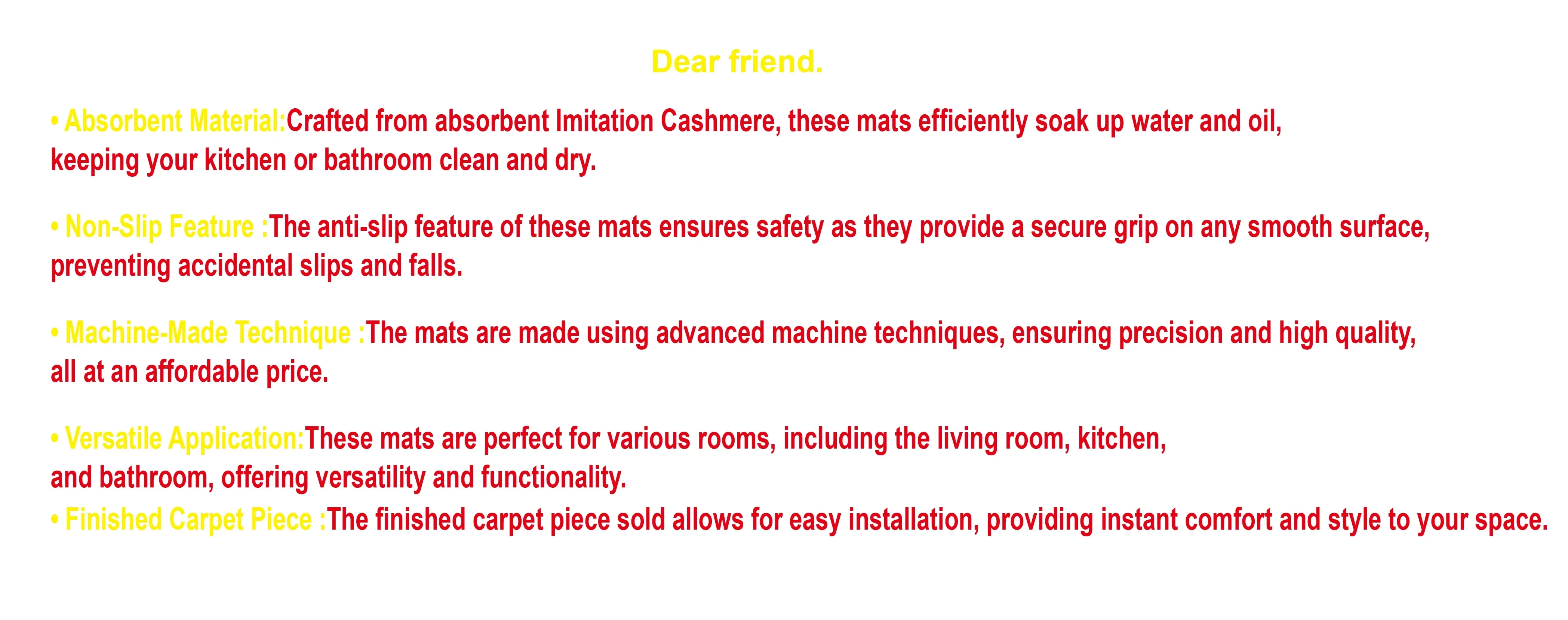 * Absorbent Material:Crafted from absorbent lmitation Cashmere, these mats efficiently soak up water and oil.