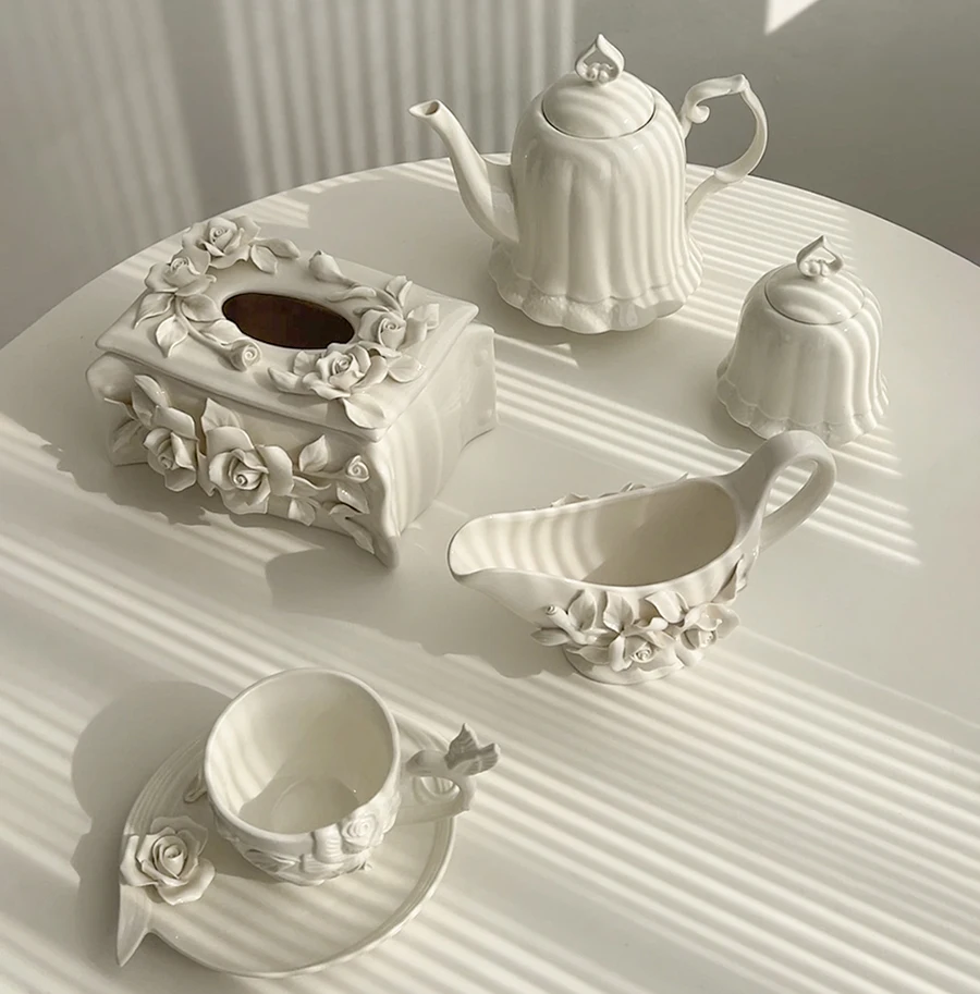 Vintage relief ceramic coffee set, hand-squeezed camellia afternoon tea set, tissue box, creative gift.