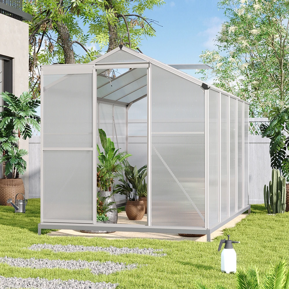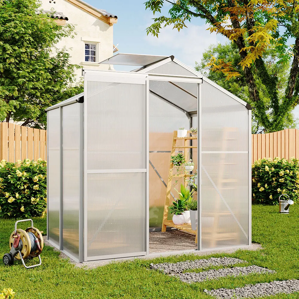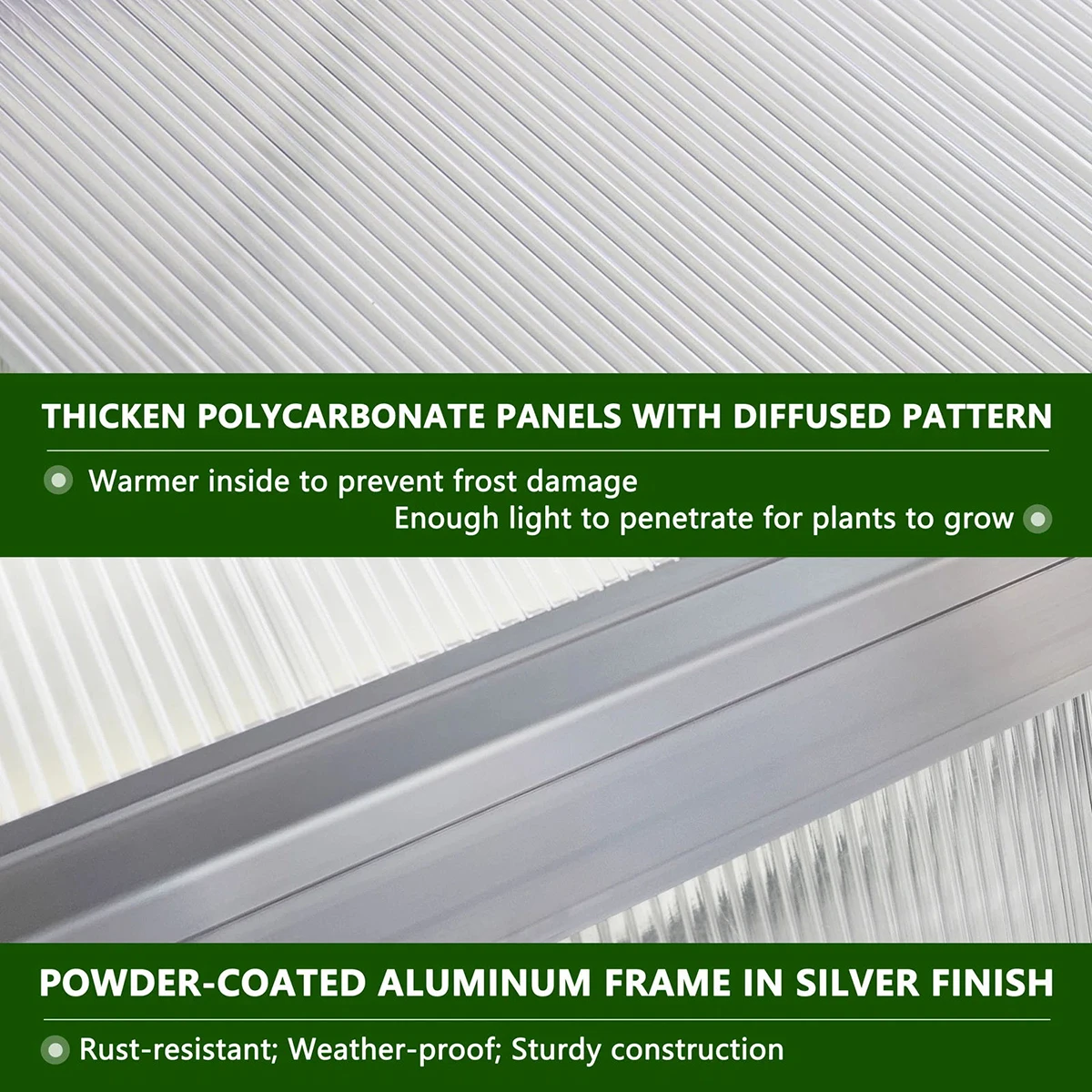 This frame of this practical greenhouse is built from superior aluminium, which lays the foundation of the upright and sturdy structure. The polycarbonate-made panels are semi-transparent, which allows you to check on the plants from time to time. To make sure that the inner environment is in the best condition, the greenhouse is paired with a window opening. An impressive greenhouse for a planting lover like you.