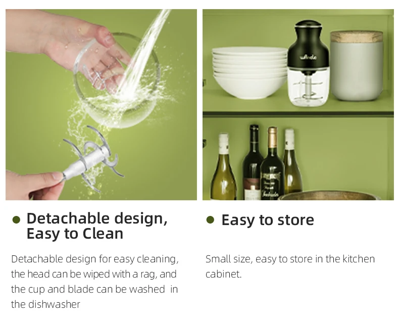 Detachable design for easy cleaning, the head can be wiped with a rag, and the cup and blade can be washed in the dishwasher