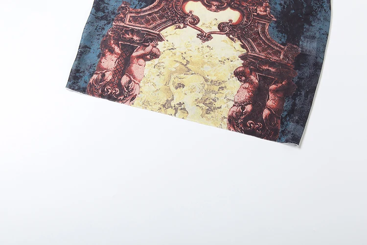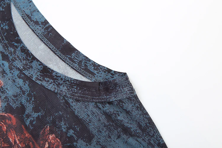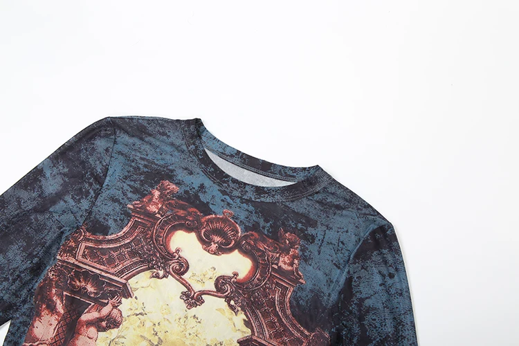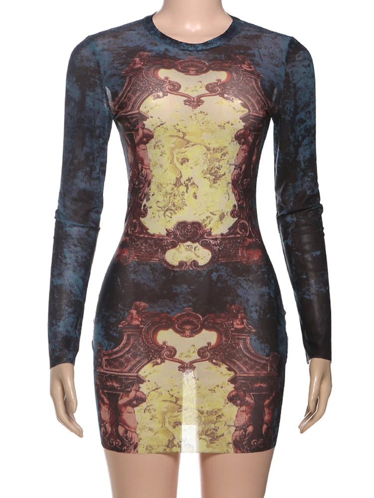 Weird Puss See Through Print Dress Women Colorful O-Neck Full Sleeve Peach Hip Hipster Street Clubwear Stretch Skinny Bodycon