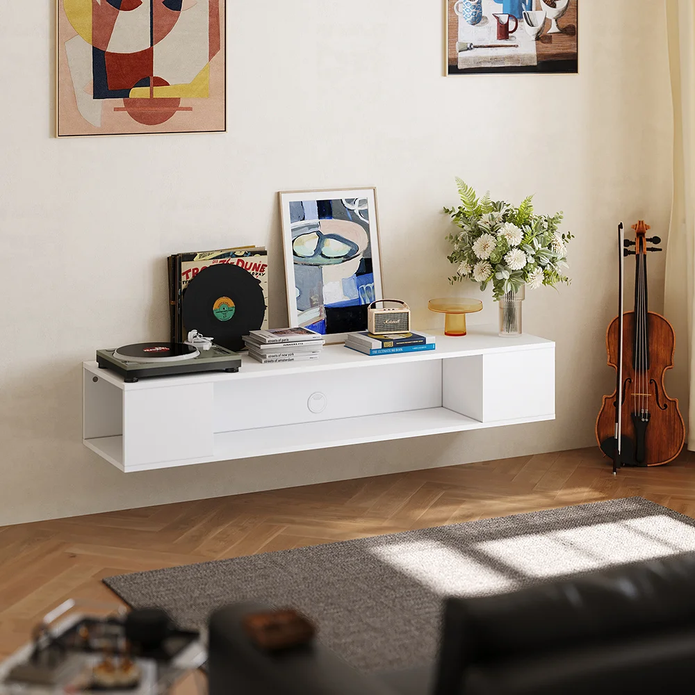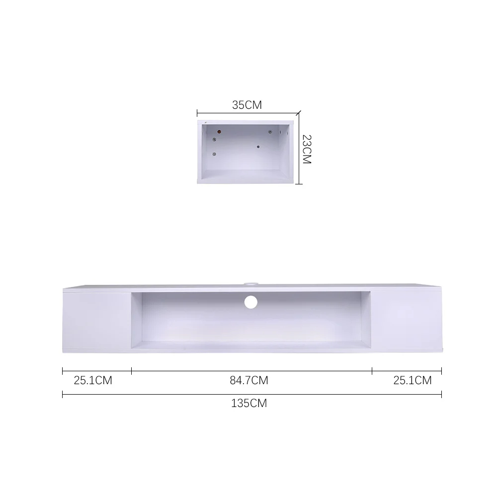 The sleek and minimalist design complements any interior decor, whether it be contemporary or traditional.Wall-mounted design saves space and creates a clean look.Constructed with durable and high-quality MDF material.Maximum load capacity of 10KG accommodates various TV sizes.Sleek and minimalist design complements any interior decor.