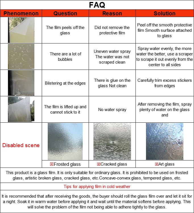 5.The window film only works on smooth, clean and flat glass doors and windows. Double pane glass, frosted glass, cut glass and all of the processed glass is NOT workable.