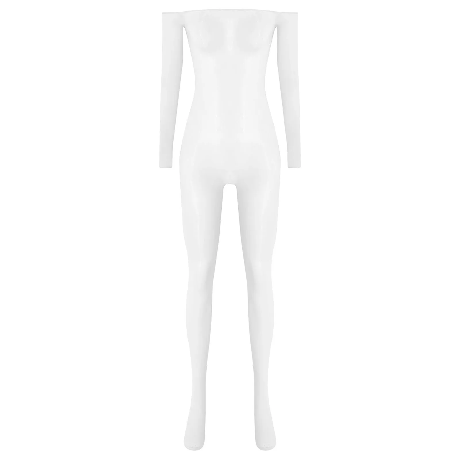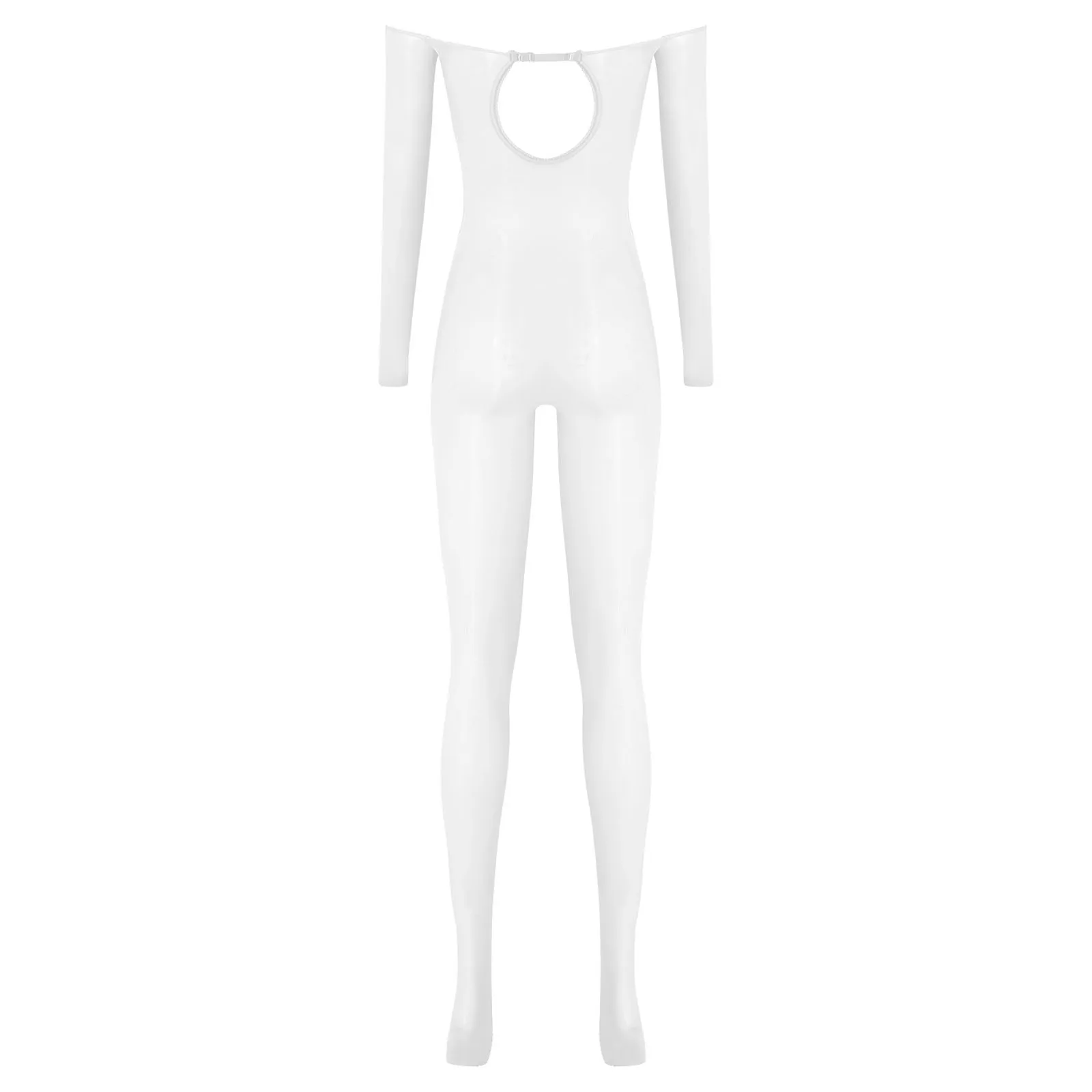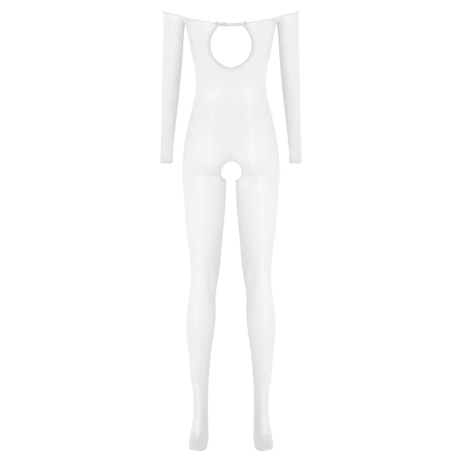 Women Glossy Sheer Jumpsuits Skinny Leotards Full Bodysuit Unitards Off Shoulder Long Sleeve Bodystockings One-piece Nightclub
