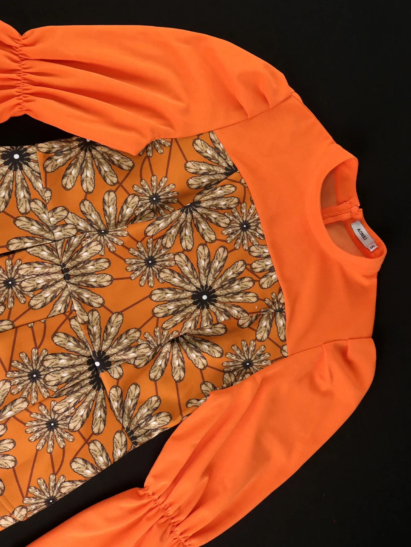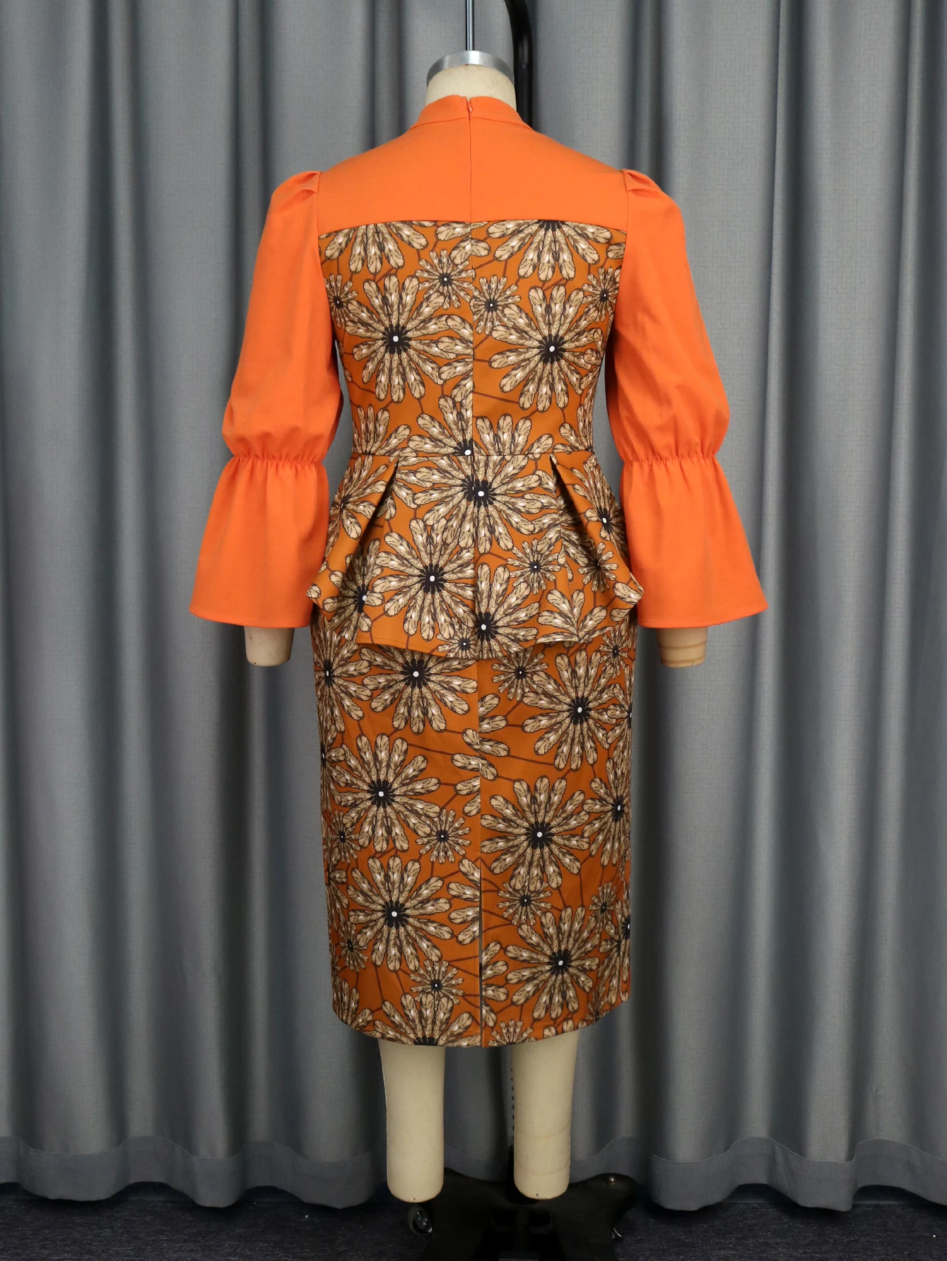 Women Orange Petal Printed Pencil Bodycon Midi Dress Round Neck Long Bell Sleeve Splice High Waist Church Event Gown Plus Size