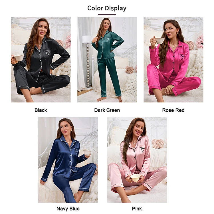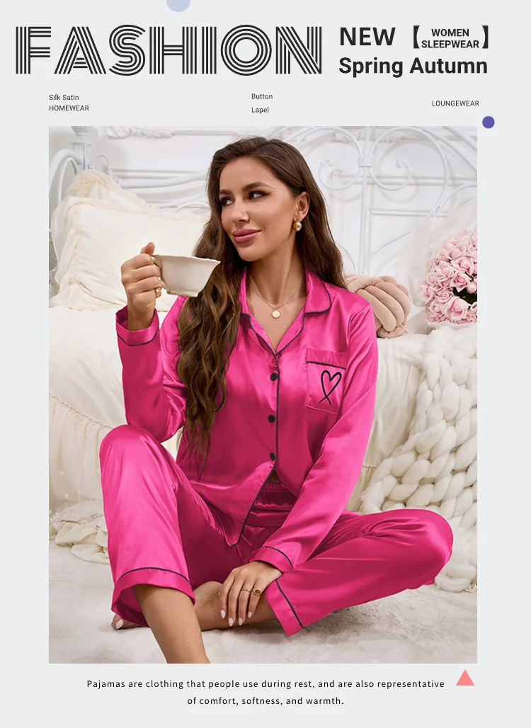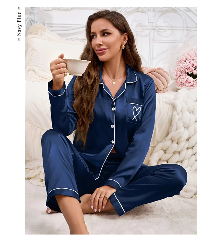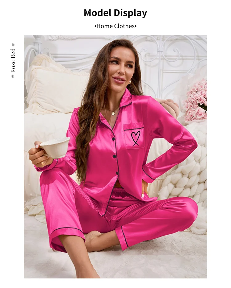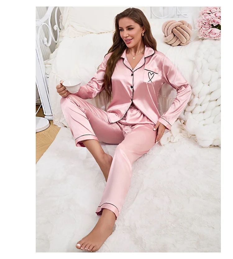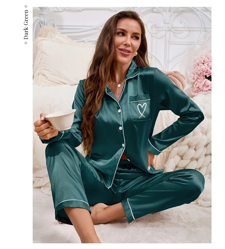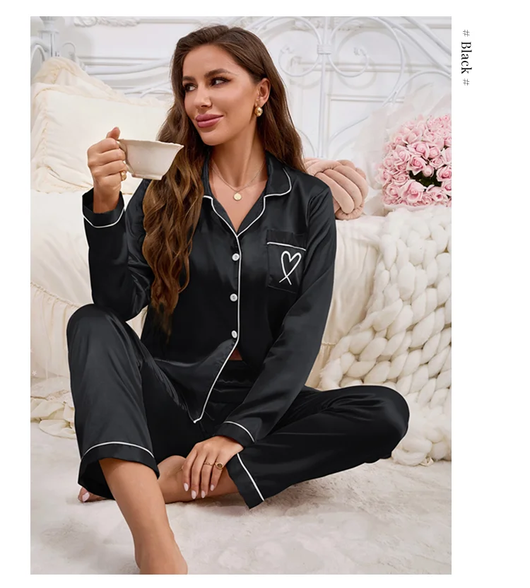 Feature: Long Sleeve Top, Lapel ,Button,Pocket, Heart-shaped Embroidery, Long Pants, Pajama 2 piece set