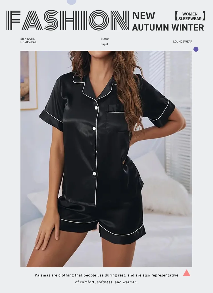 Women Silk Satin Pajamas Set Two-piece Pj Sets Sleepwear Loungewear Button-Down Pajama Women 2 Piece Pijama Homewear Shorts Set