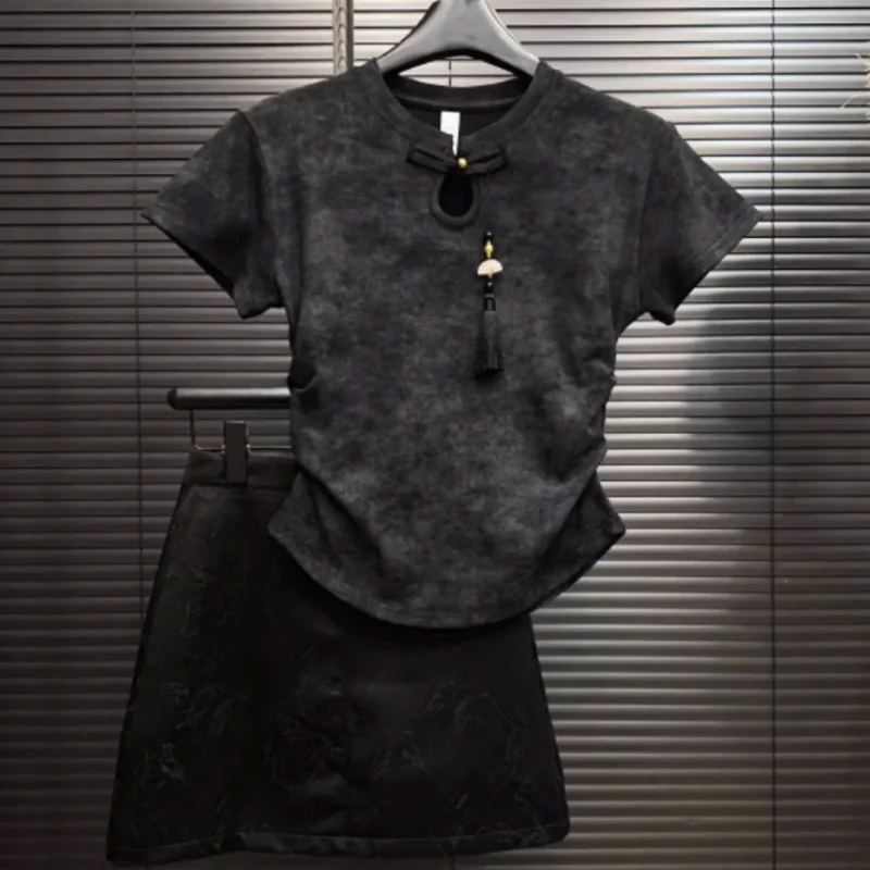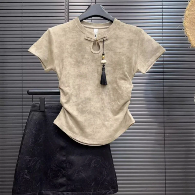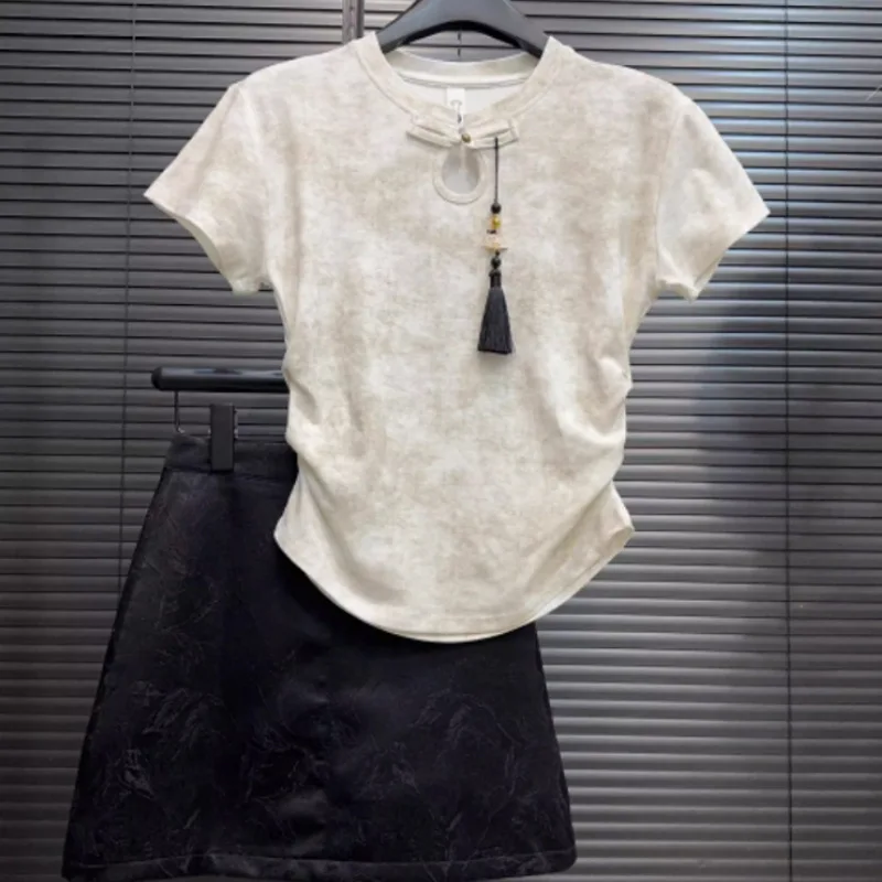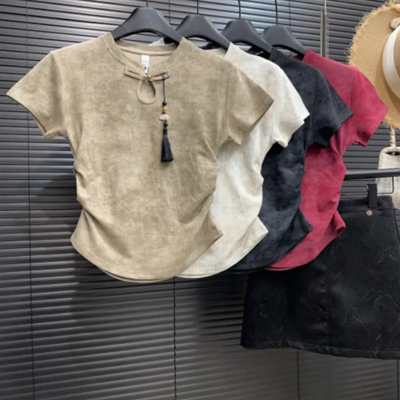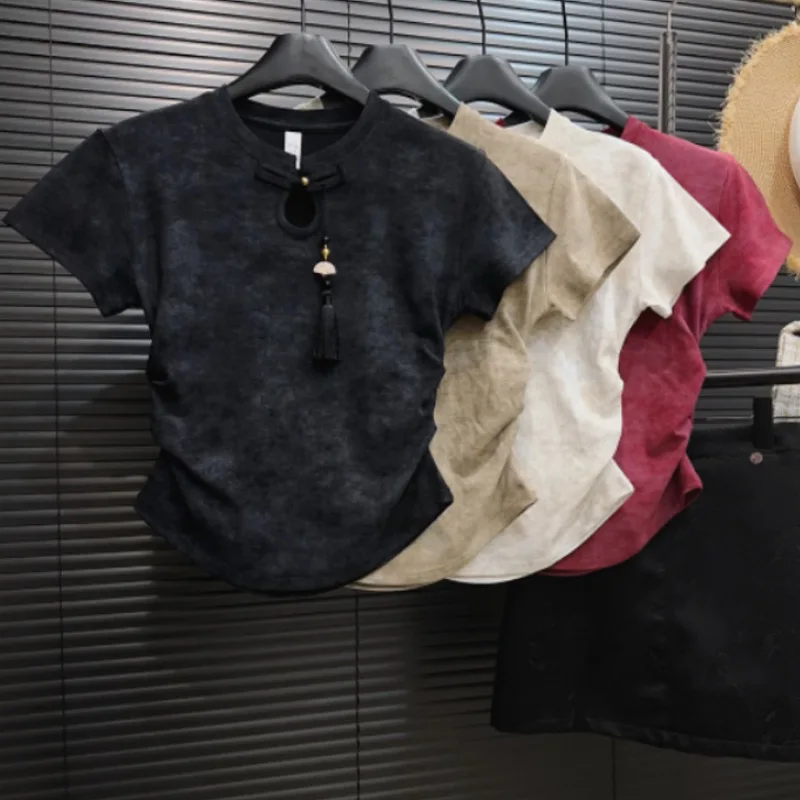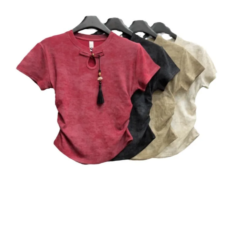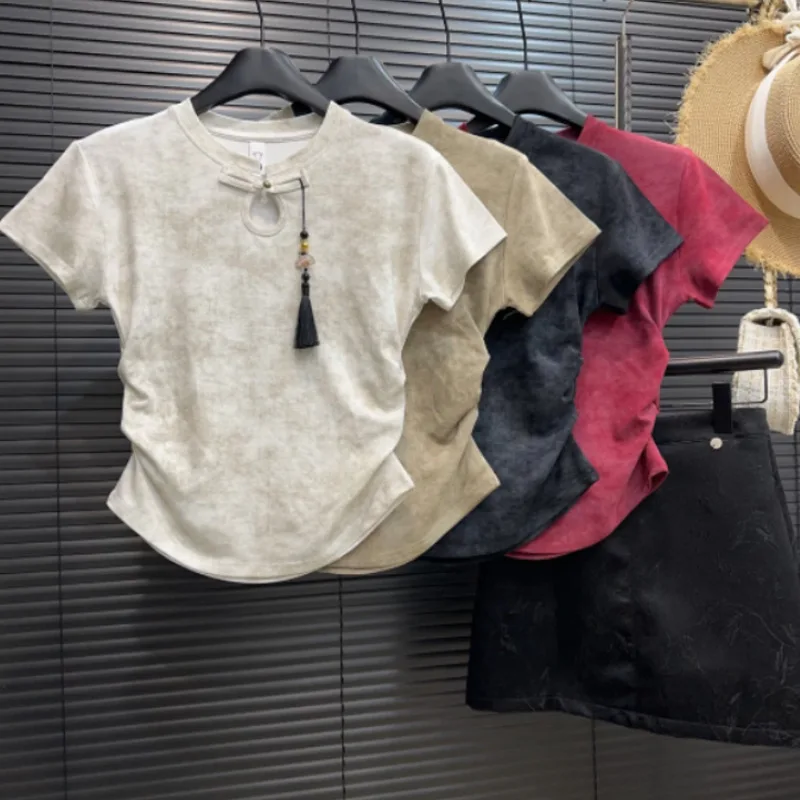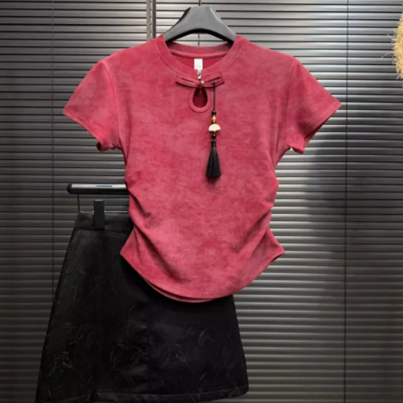 1 review for Women Summer Short Sleeve T-shirts Solid O-Neck Elegant Buckle Decoration Slim Casual Soft High Quality Ladies Clothing Tees