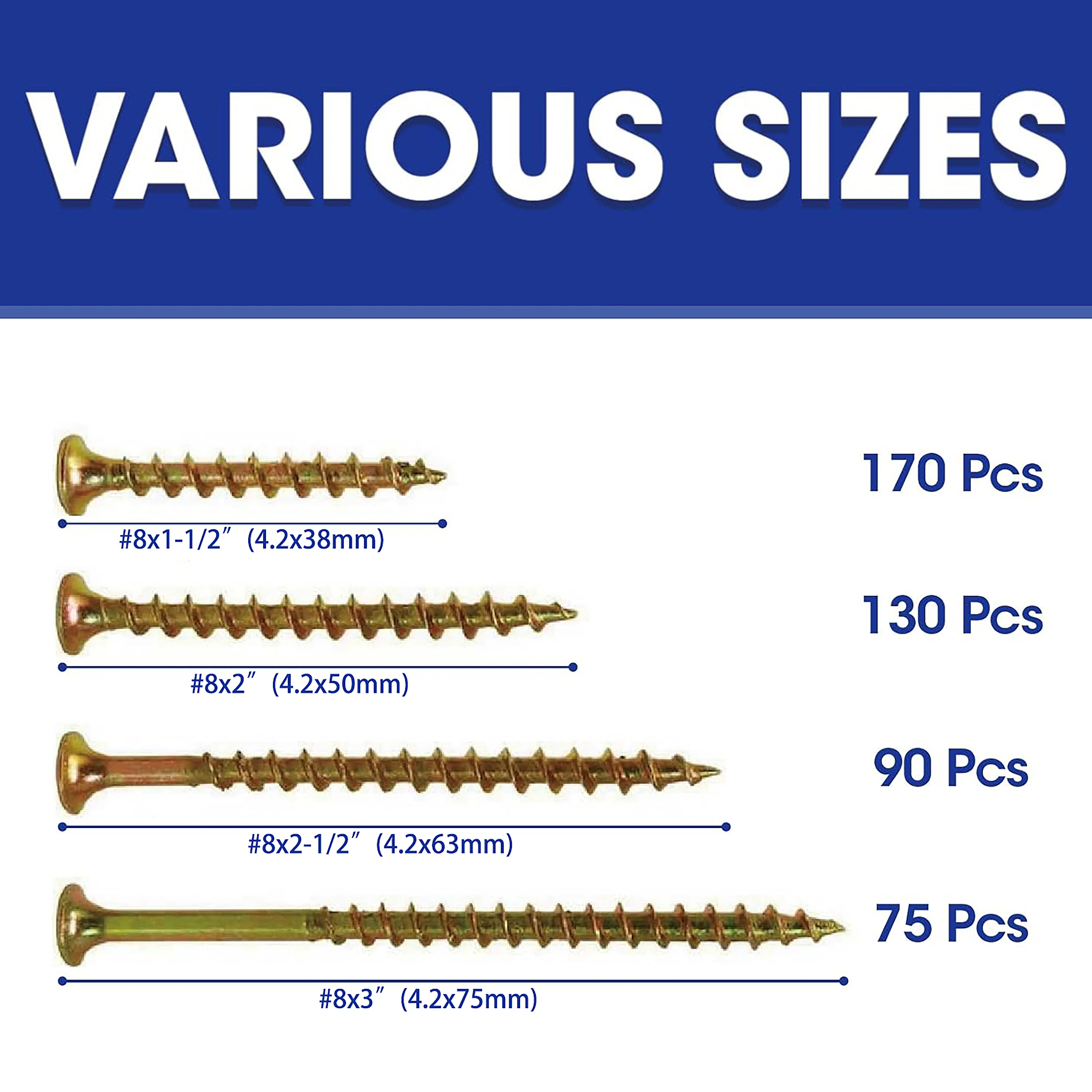 E  #8×1-1/2(4.2*38mm) 170PCS  #8×2 (4.2*50mm)  130PCS  #8×2-1/2 (4.2*63mm) 90PCS  #8×3 (4.2*75mm)75PCS +1 BOX
