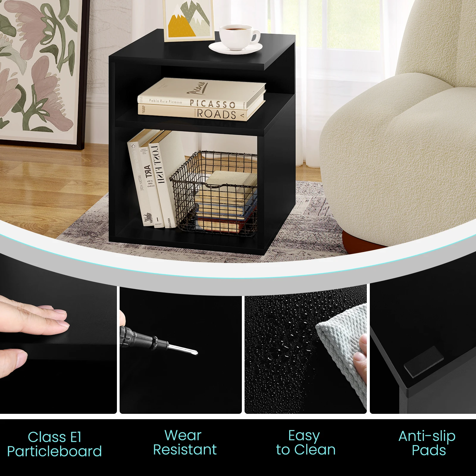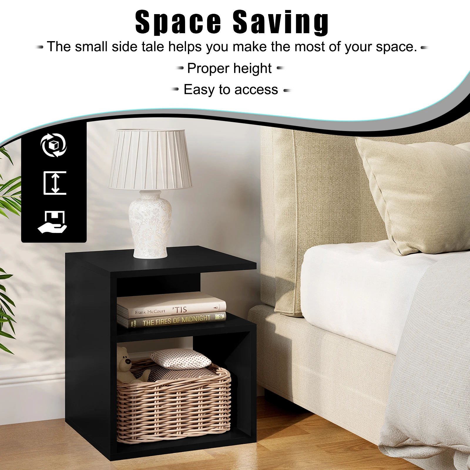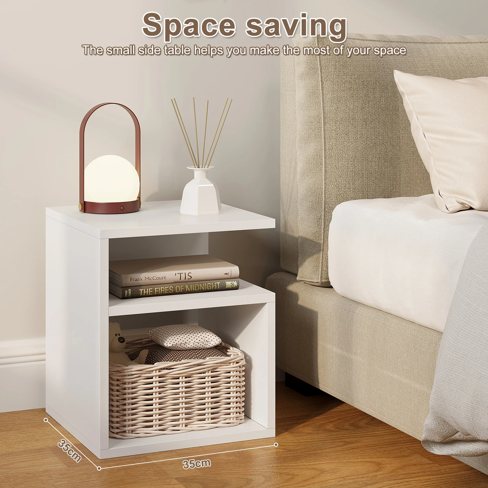 • Space-saving and easy to assemble: the side table with storage space measures 35 x 41.5 x 35 cm, its clear square shape allows for quick and easy assembly and optimal use of space, as it adapts perfectly to the wall and edge of the bed