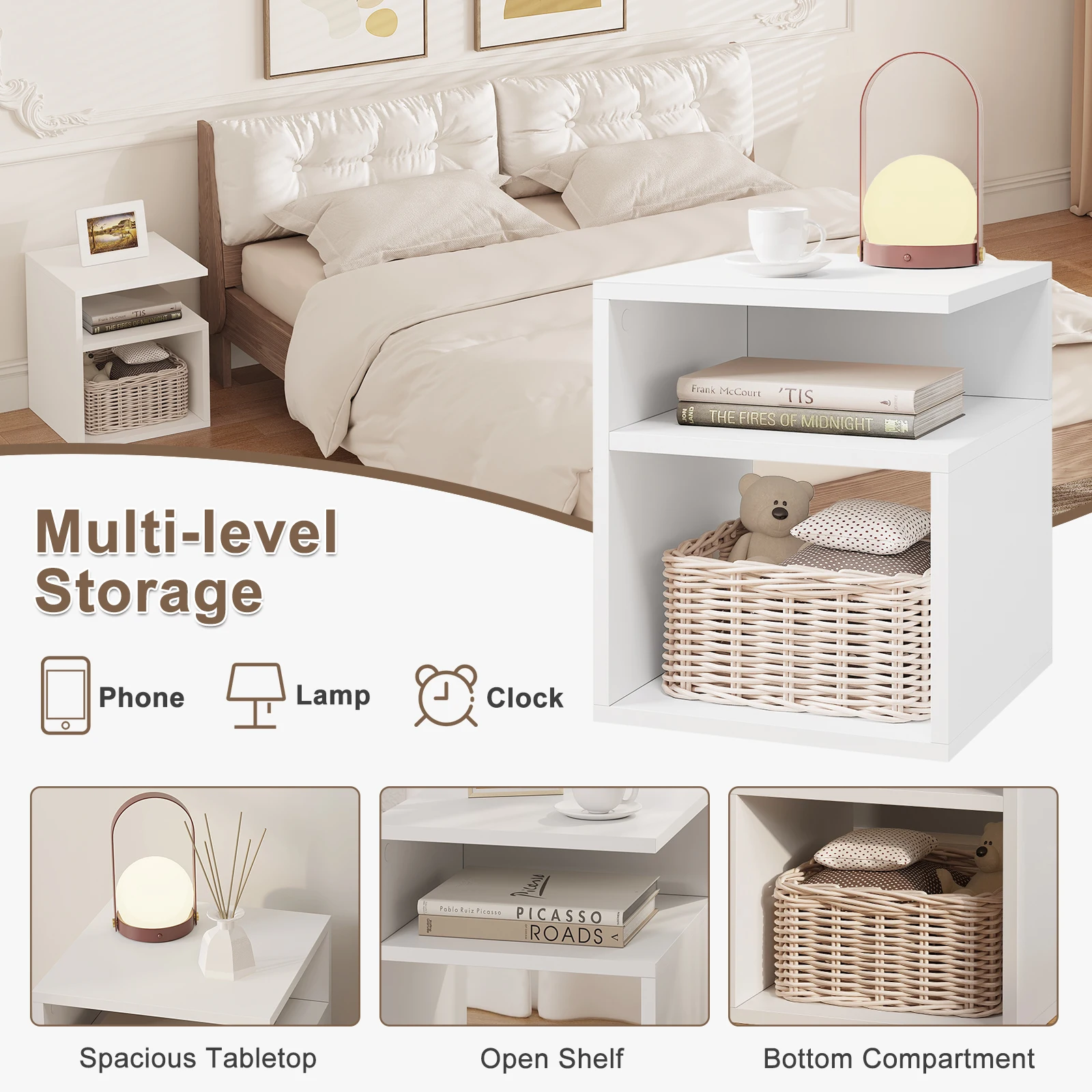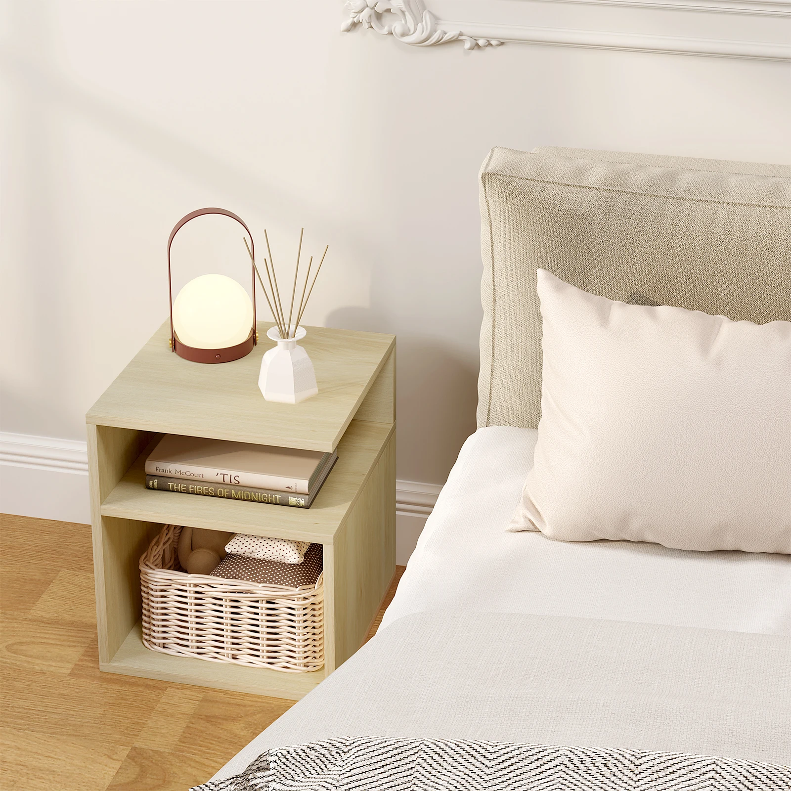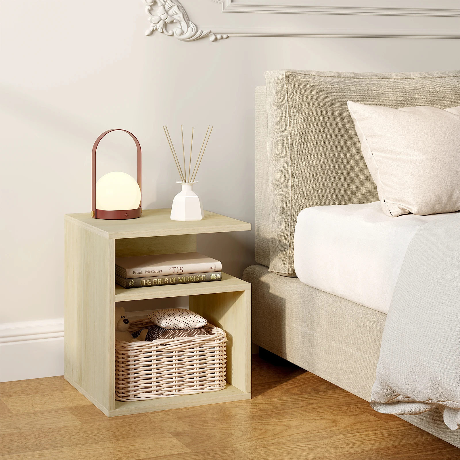• DIVIDED STORAGE: The bedside cabinet is beautiful and practical. The table top has space for picture frames, lamps, cups etc., the middle compartment for personal items such as mobile phone and the bottom compartment for books and magazines. Everything comes in order