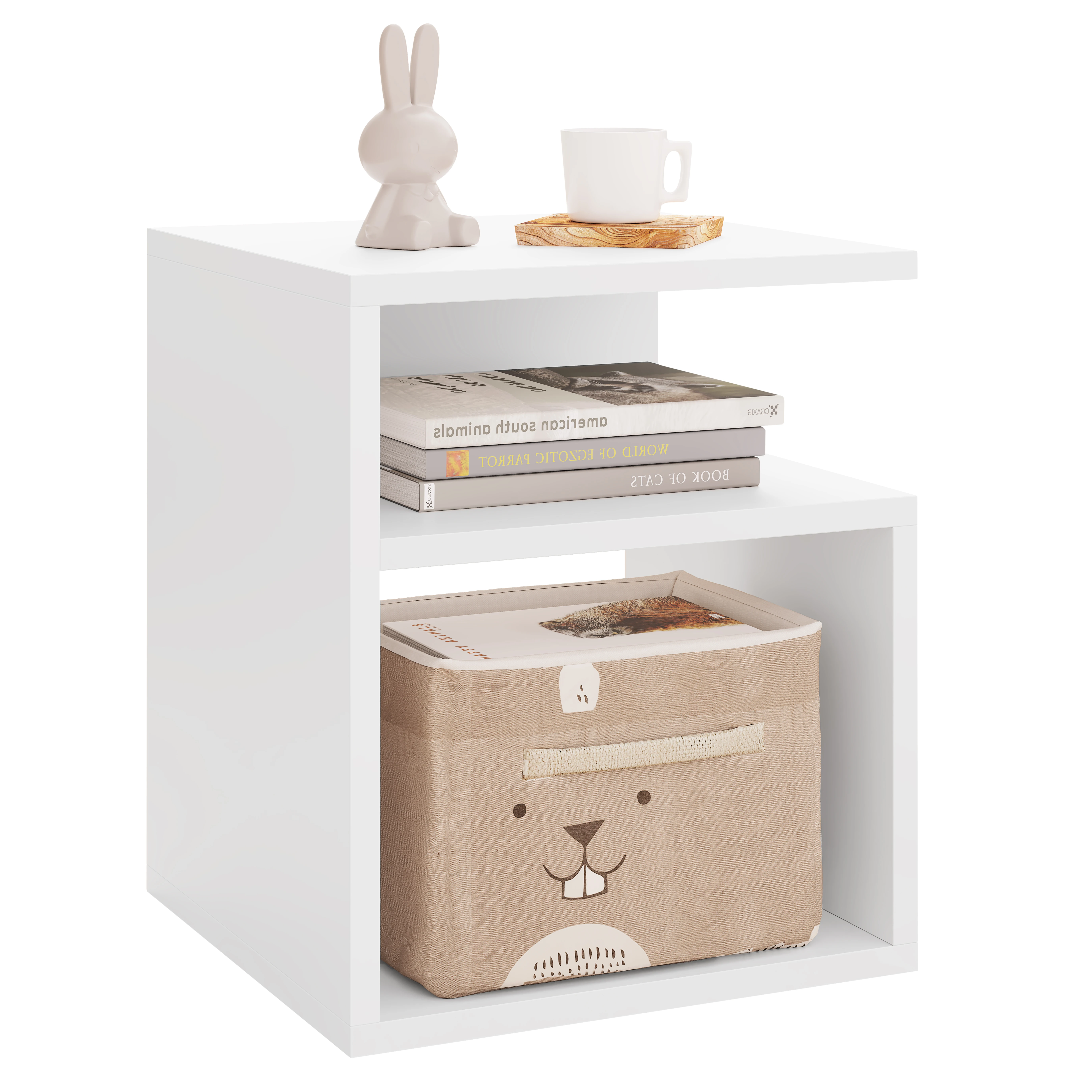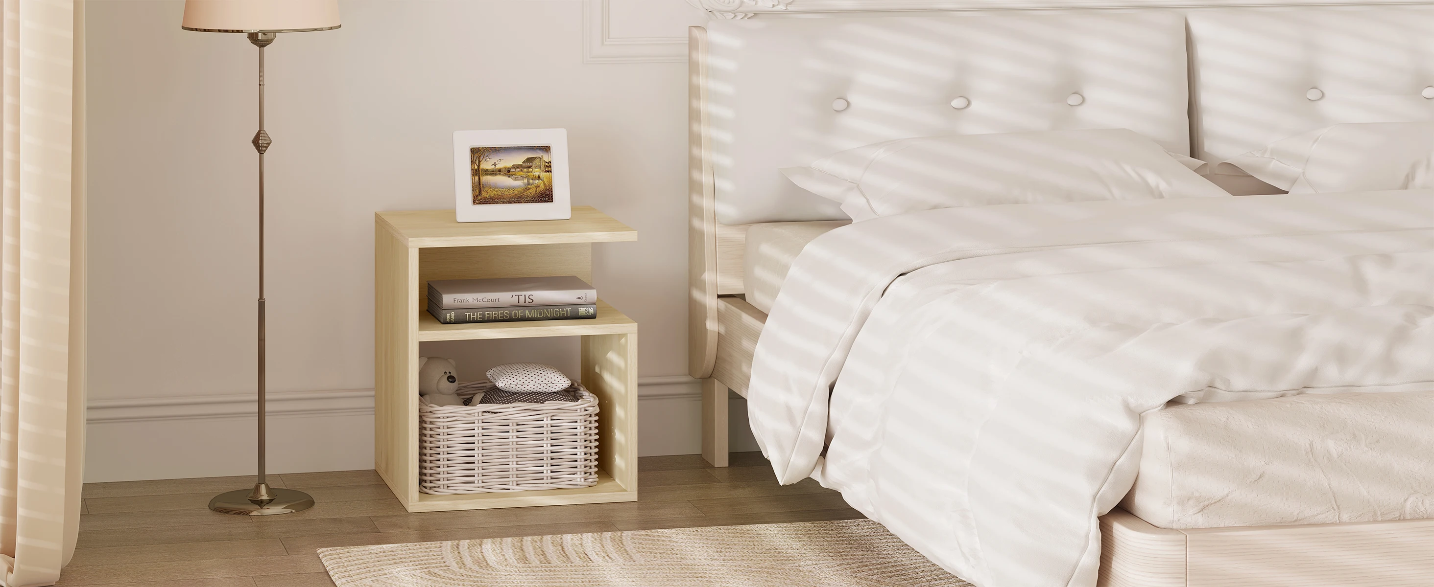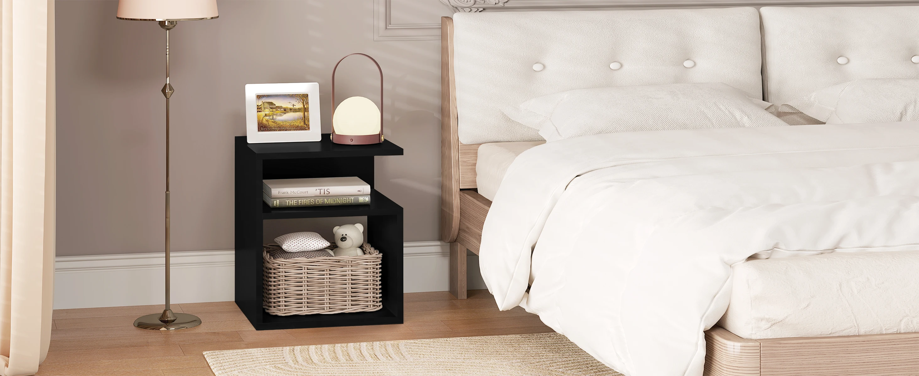 • DIVIDED STORAGE: The bedside cabinet is beautiful and practical. The table top has space for picture frames, lamps, cups etc., the middle compartment for personal items such as mobile phone and the bottom compartment for books and magazines. Everything comes in order