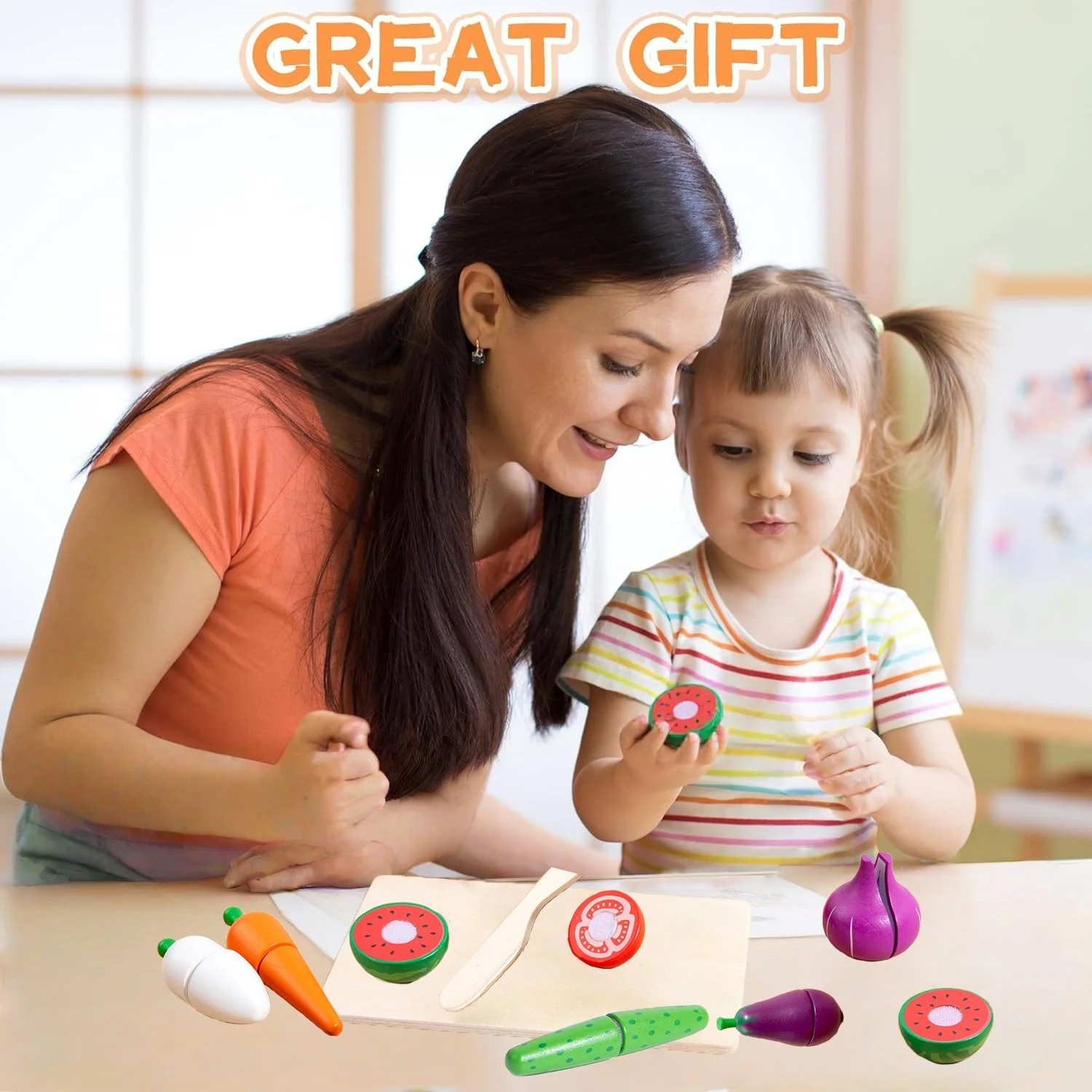 【Educational Fun】The colorful wooden cutting toy food play set introduces math concepts of part and whole, develops color recognition and fine motor skills, and helps identify fruits and vegetables. Offering your kids hours of screen-free fun.