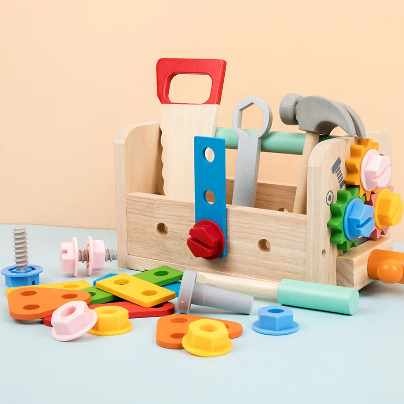 Ignite your child's passion for building with this wooden toolbox toy! The set contains colorful gears, nuts, bolts, and tools like wrenches and screwdrivers to get the little ones into their hands – DIY fun.