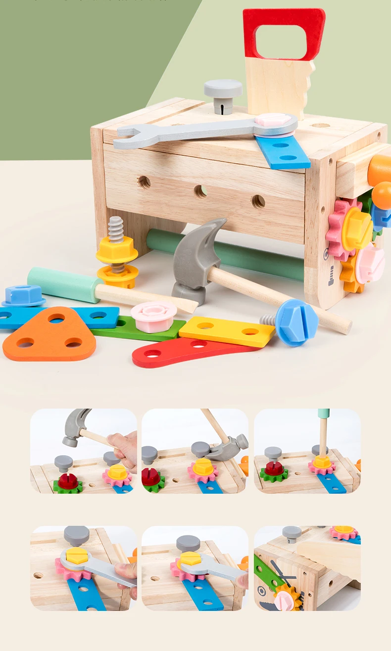 Each piece is made of child-safe wood with smooth edges for durability and is suitable for little hands. Whether playing solo to create unique designs or collaborating with friends and family, this toolbox transforms playtime into a creative learning adventure. This is an ideal educational toy that combines engineering fun with skill development to help children build confidence and curiosity!