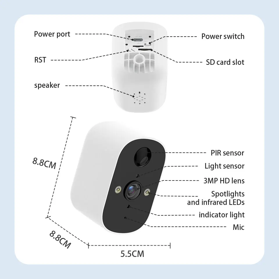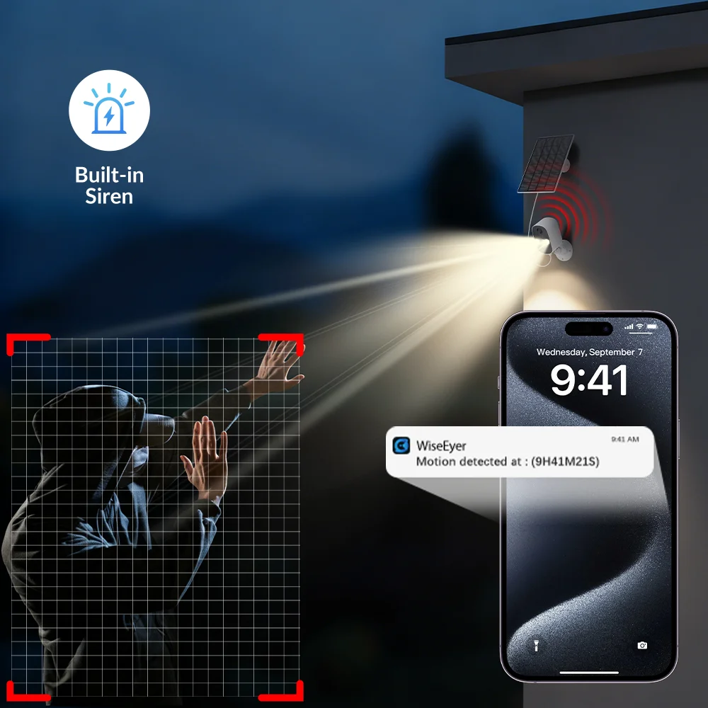 In addition, the camera can also provide audible and visual alarms, when the wireless camera detects motion, it will emit a dazzling light and piercing alarm sound to repel intruders.