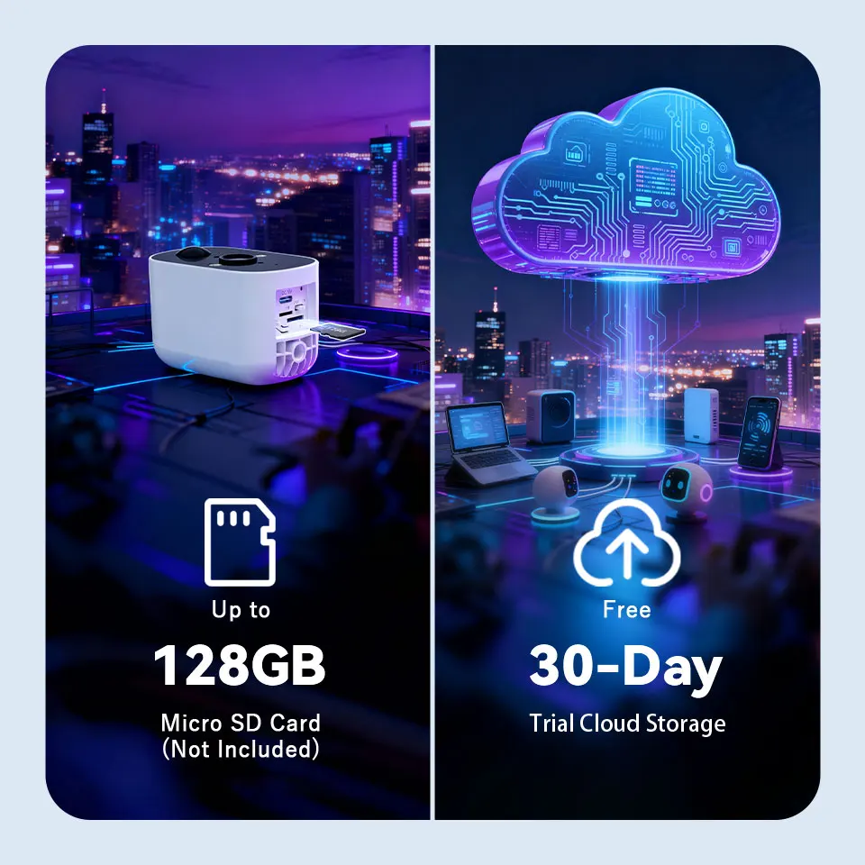 Supports up to 128G TF card and cloud storage,and offer free rolling past 3 days cloud storage, 30 days free trial, when the cloud storage trial end,it will be charged.
