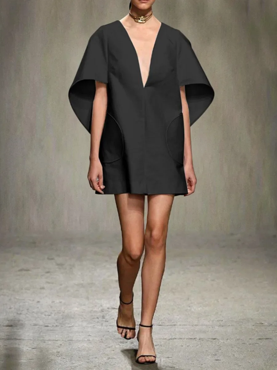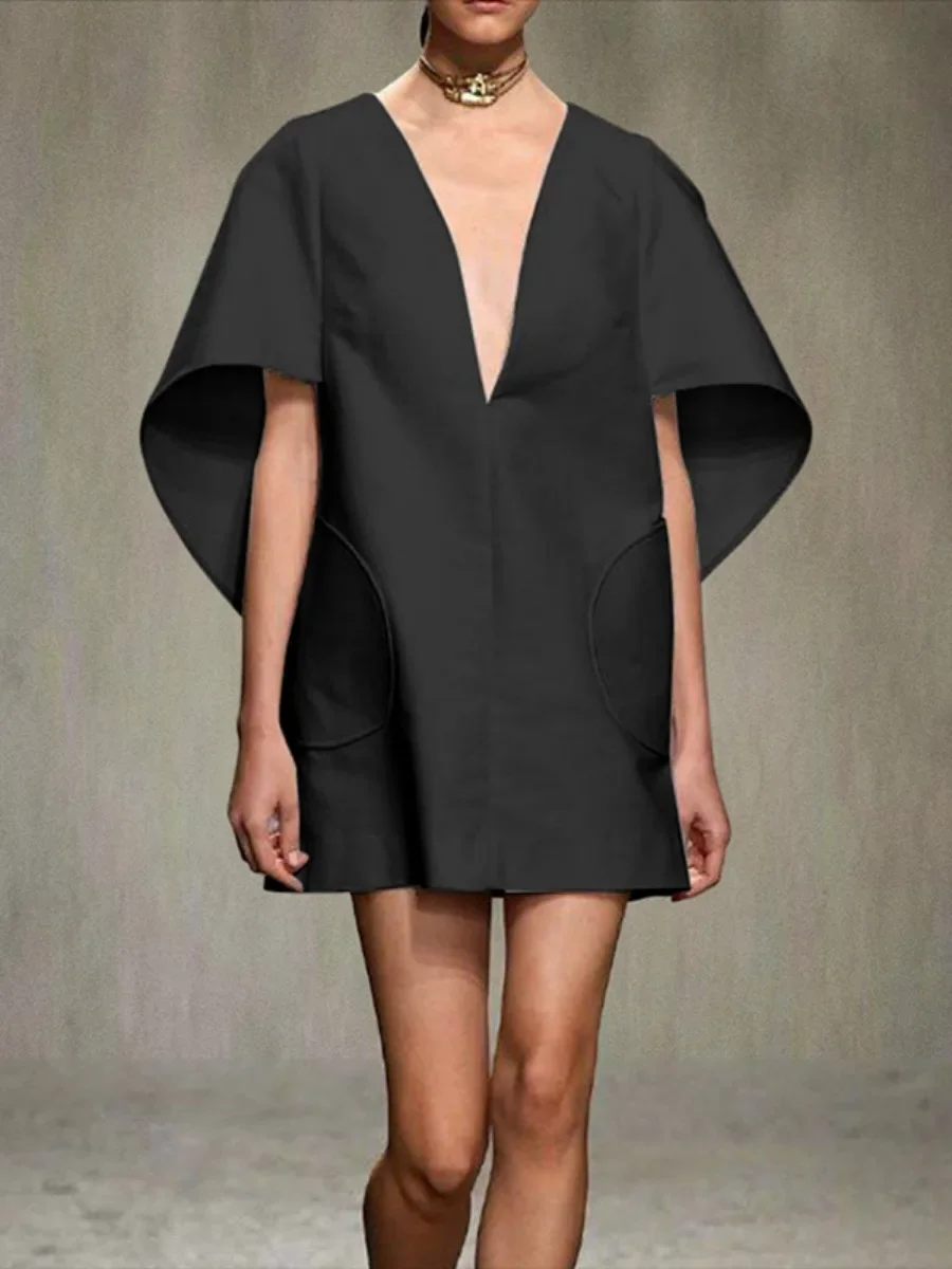 Yeezzi Fashion Black White Color Short Dress For Women 2024 New Spring Deep V-neck Half Sleeves Loose Prom Party Mini Dresses