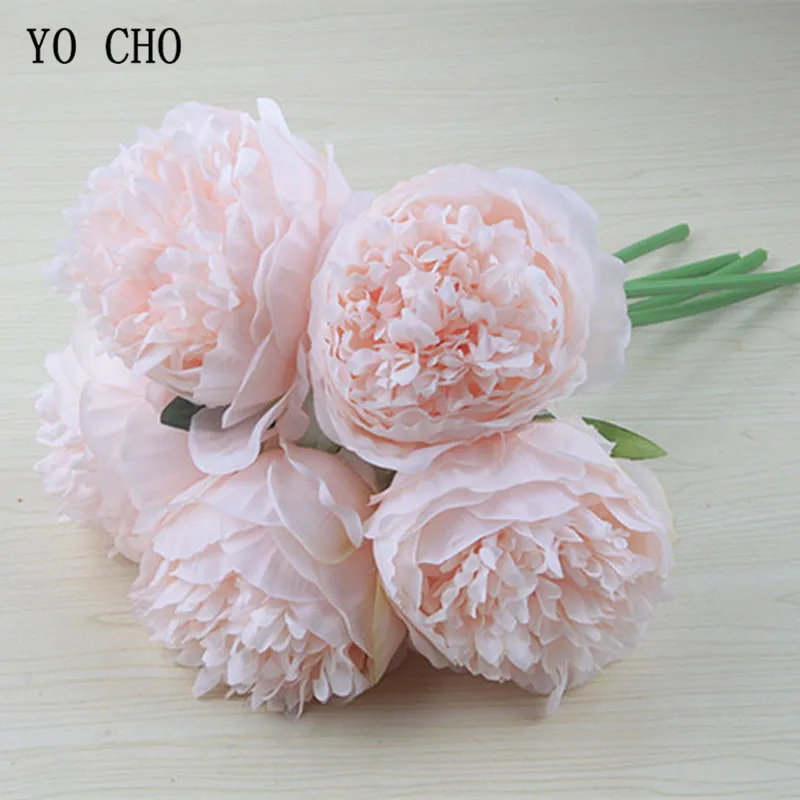 YO CHO 5pc Big Peony Artifcial Silk Flower Wedding Bouquet Decor White Peony Home Display Fake Flower Pack Heart Peony Pink Rose