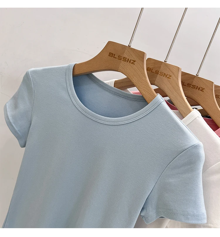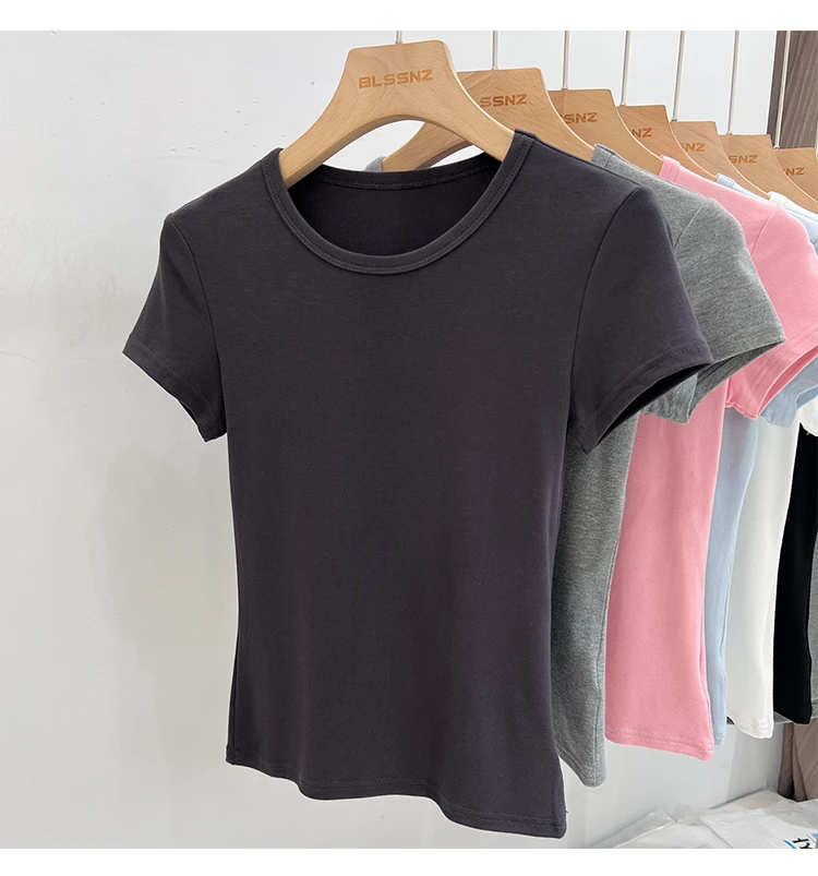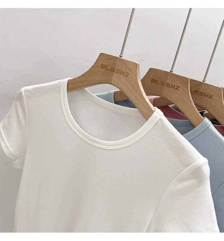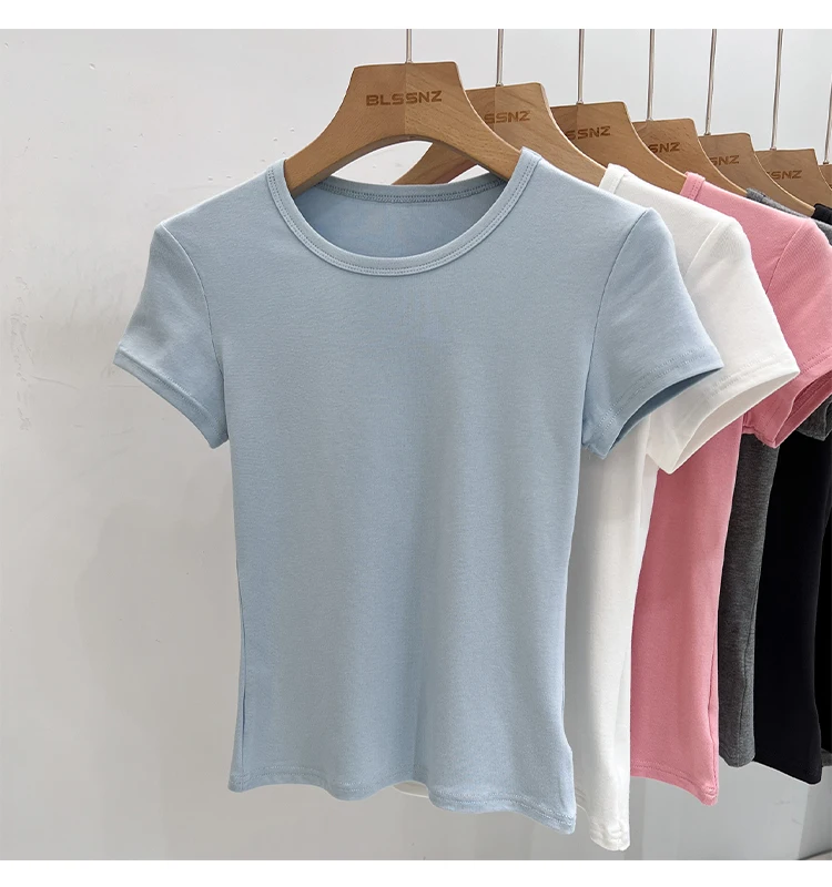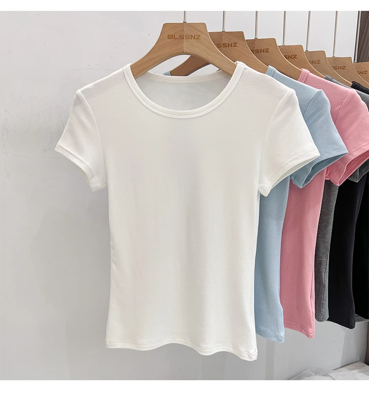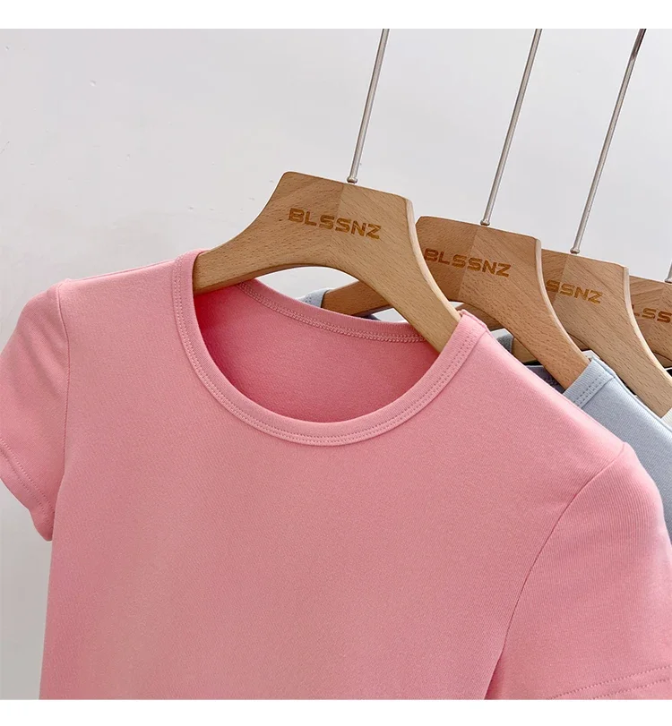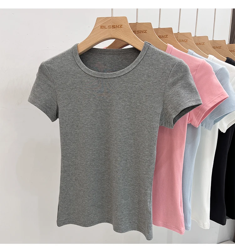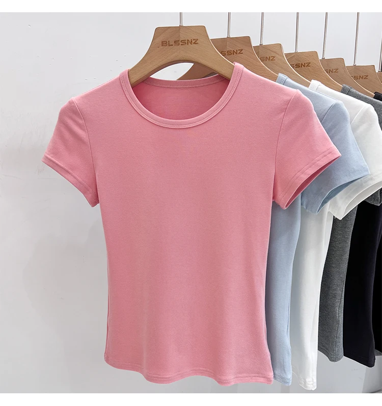 Zjaiss 2026 Summer Slim Fit Cotton Top Women’s Trendy O-Neck Short Sleeve Women T-Shirt Korean Style Solid Color Versatile Tee