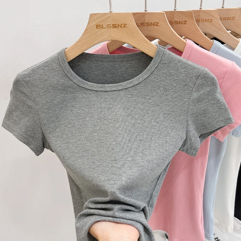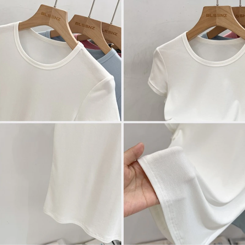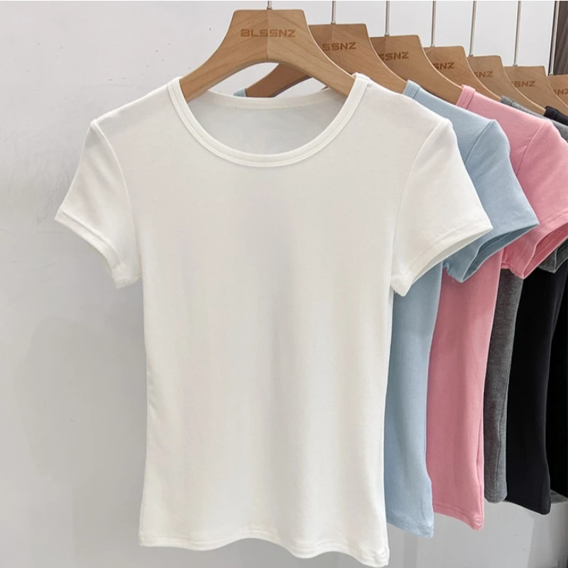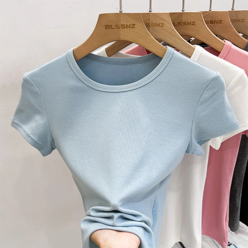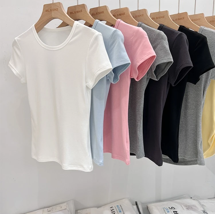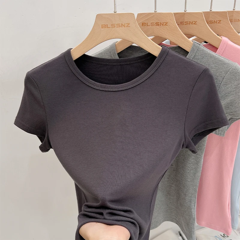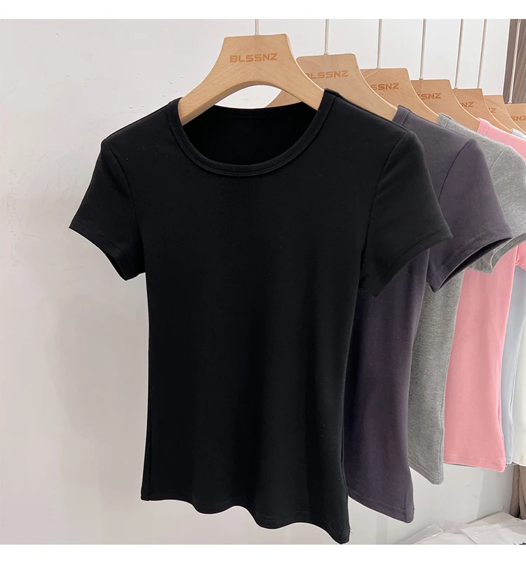 Zjaiss 2026 Summer Slim Fit Cotton Top Women’s Trendy O-Neck Short Sleeve Women T-Shirt Korean Style Solid Color Versatile Tee