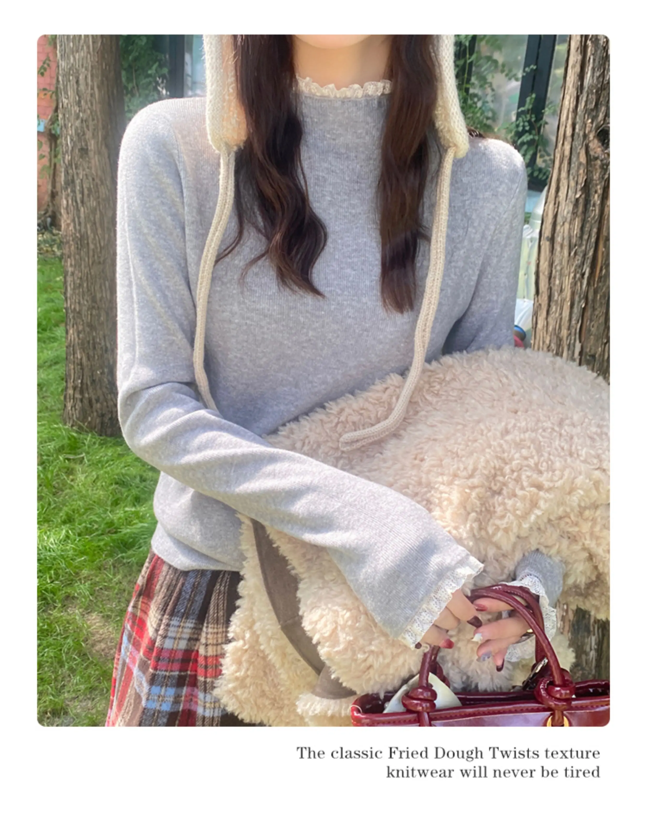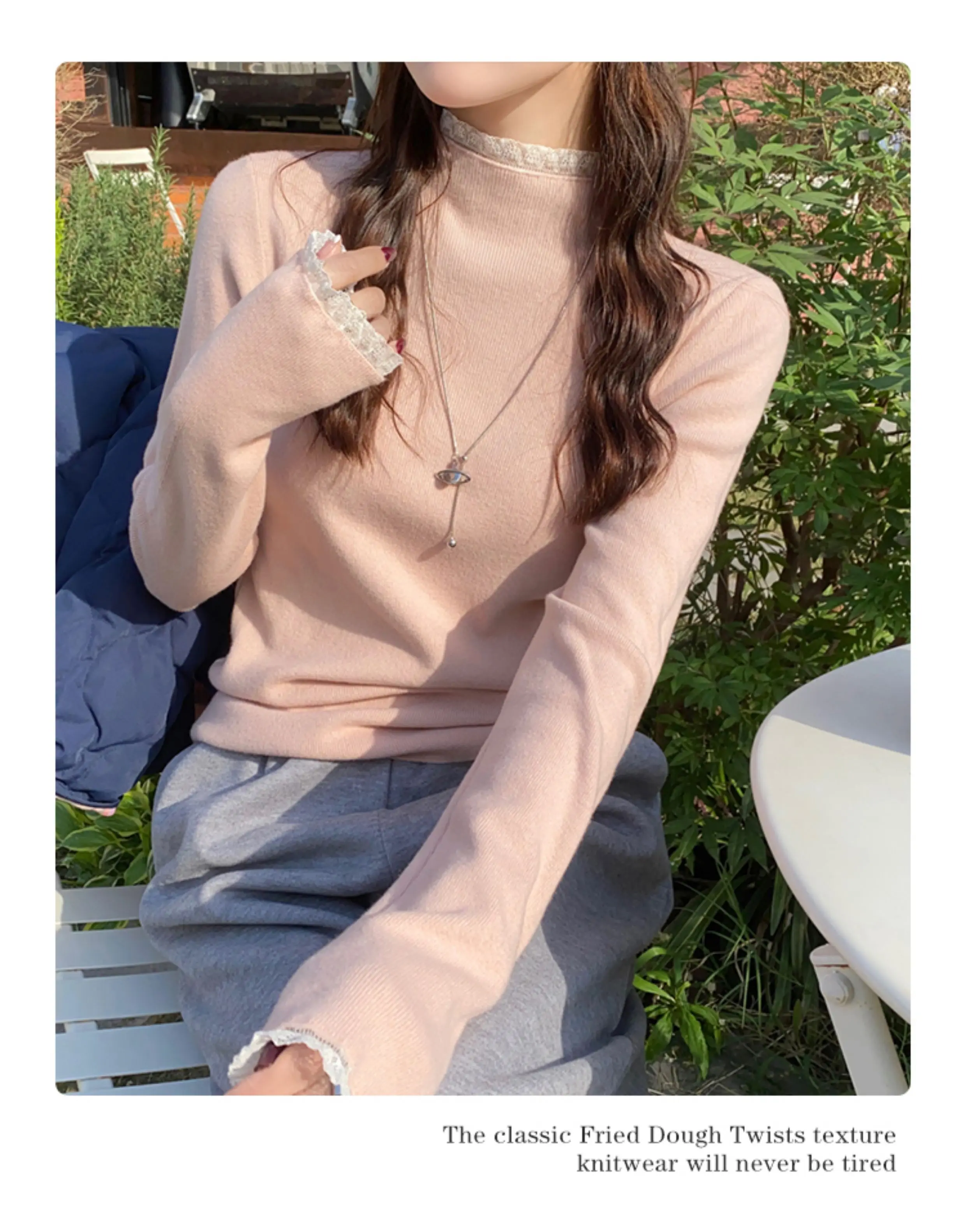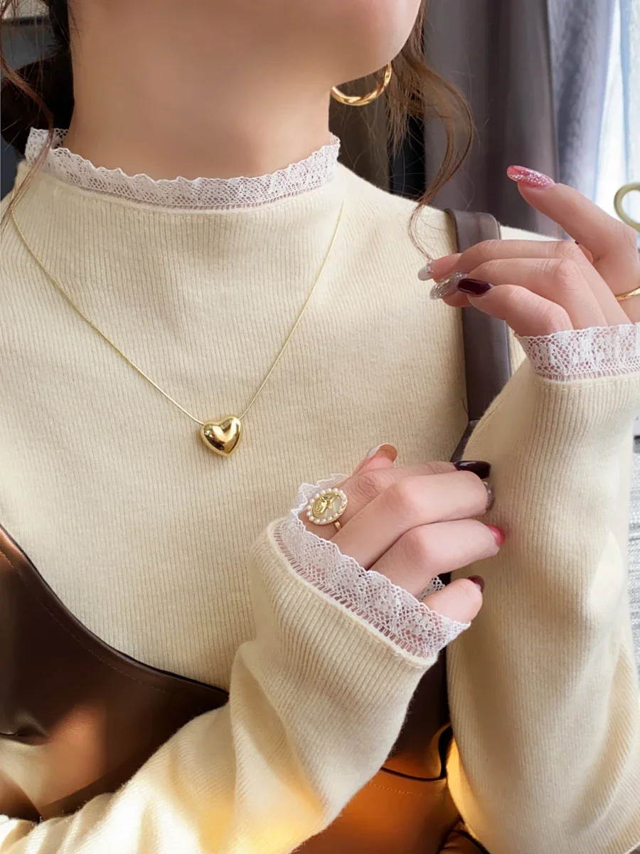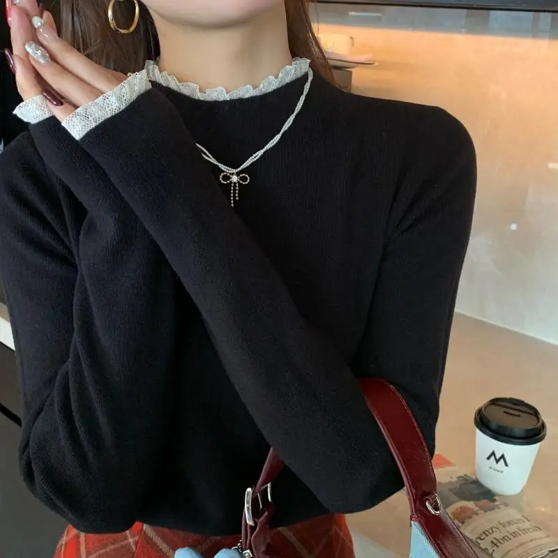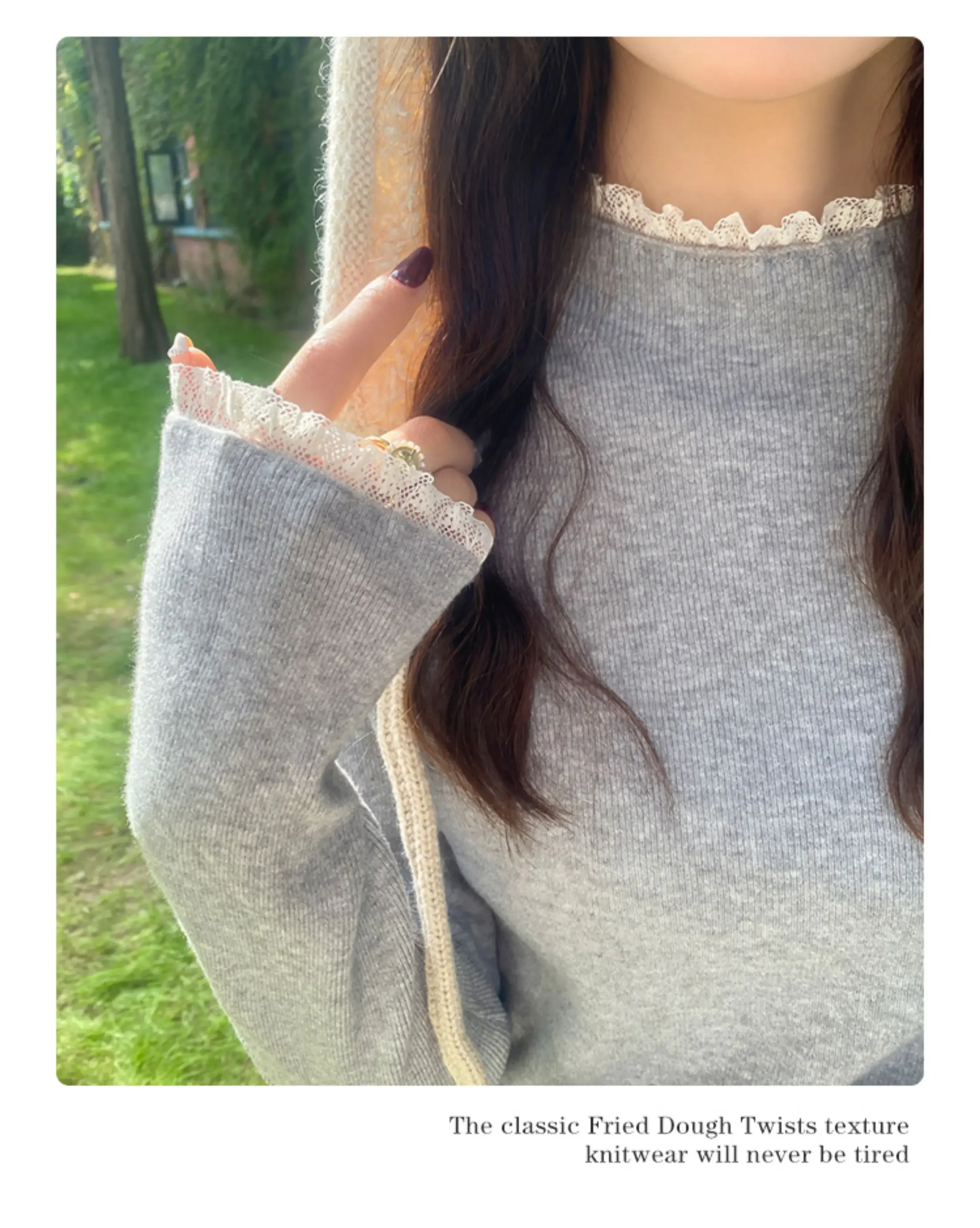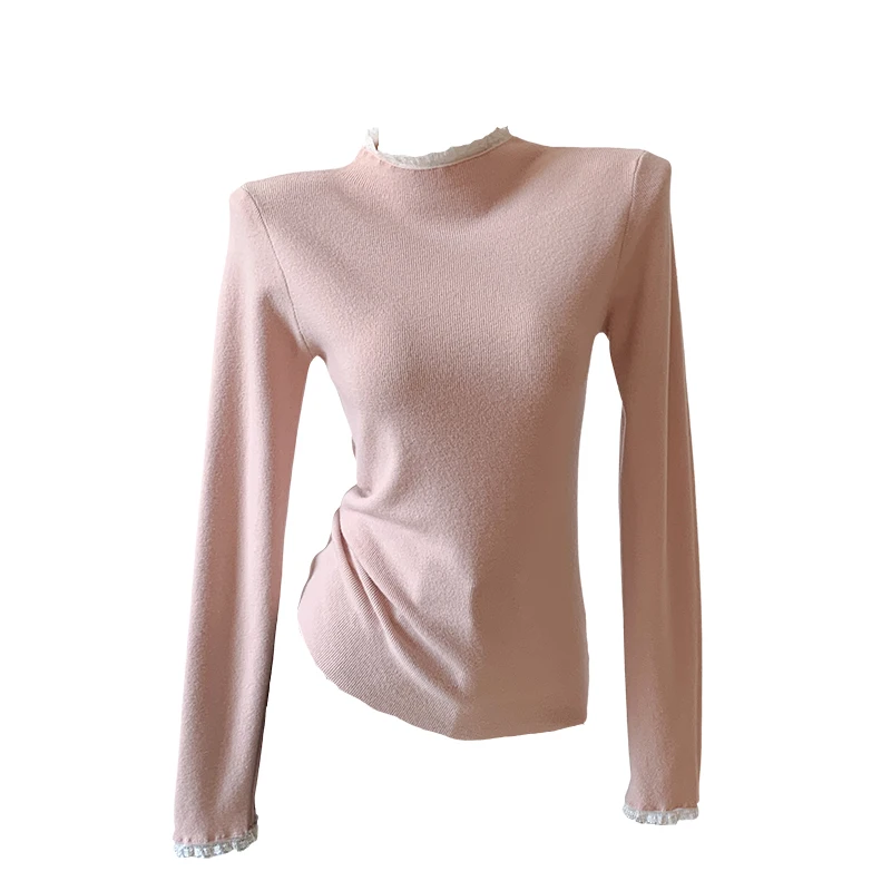 Zjaiss Spring Autumn Grey Slim Fit Long Sleeves Pullovers Womens Elegant Lace Trim Sweater Korean Style Simple Base Layer Tops