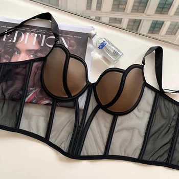 French Ladies Transparent Mesh Corset Sexy Shaper Thin Bra Set...